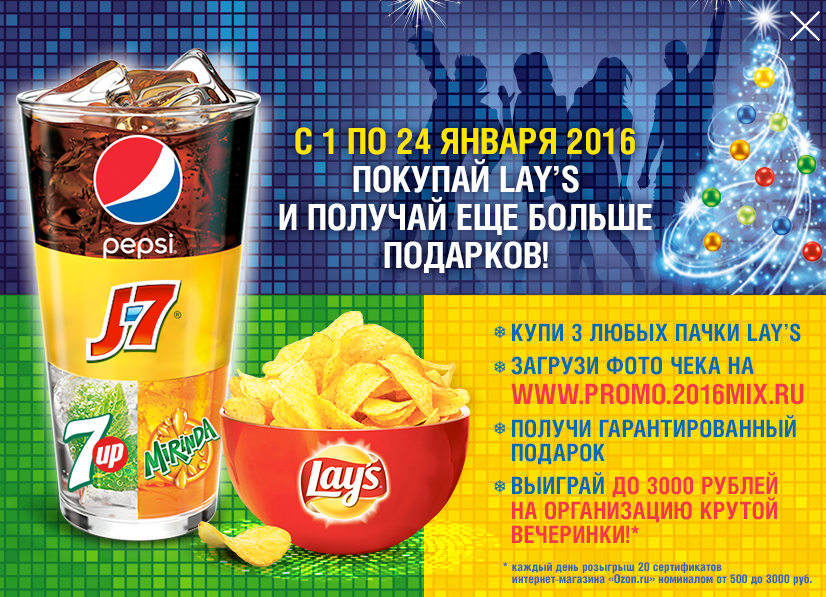 - Купи 3 любые 3 товара участвующих в акции: Lay's, Pepsi, J7, Mirinda, 7UP ;