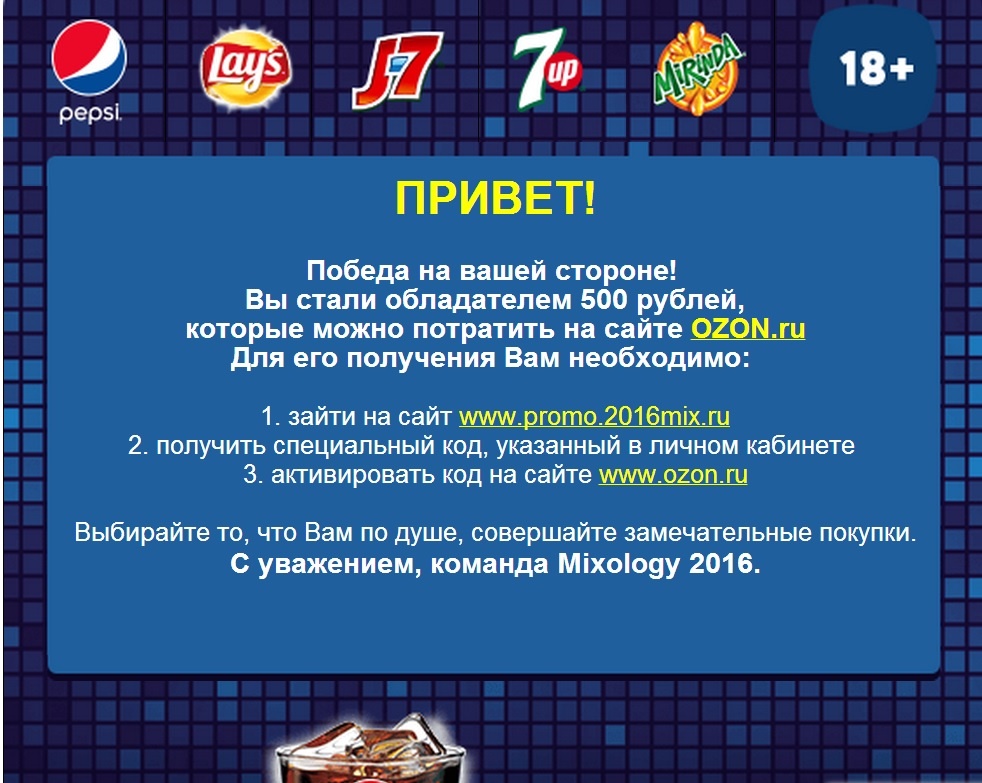 Участвуй в акции, покупай продукцию брендов LAYS, Pepsi, J7, Mirinda, 7UP, регистрируй чеки и выигрывай призы!