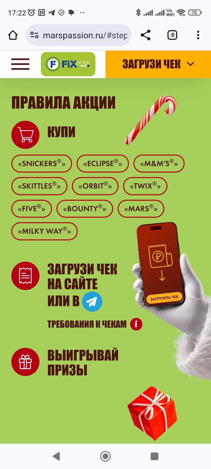 - Покупайте продукцию Snickers, Eclipse, M&M's, Skittles, Orbit, Twix, Five, Bounty, Mars, Milky Way, Rondo, Doublemint, Spearmint на сумму от 200 рублей в любом магазине торговой сети «Fix Price»;
