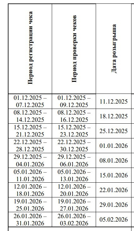 - Сроки приобретения Продукции покупателем (как она указана в п.1.5 настоящих Правил) для участия в Акции: с 00 часов 00 минут 01 секунда «01» декабря 2025 года по 23 часа 59 минут 59 секунд «31» января 2026 года.