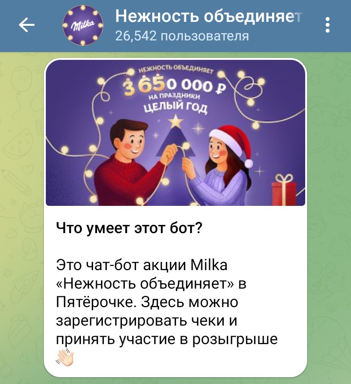 Покупайте продукцию Milka, Oreo, Юбилейное в магазине торговой сети «Пятёрочка» с 1 декабря 2025 года по 31 января 2026 года, регистрируйте чеки в чат-боте акции и выигрывайте призы.