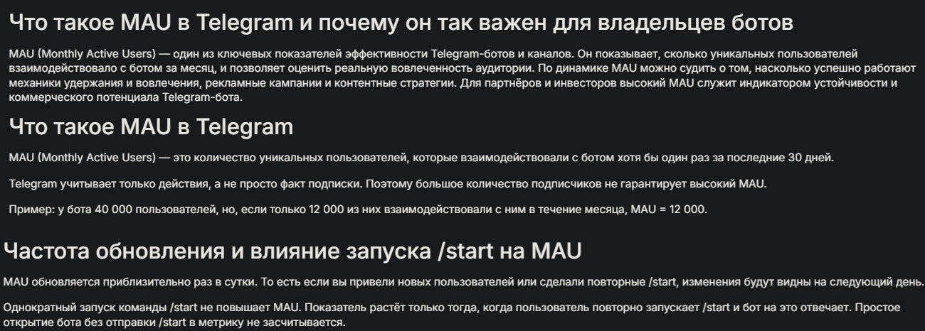 Для партнеров и инвесторов высокий MAU служит индикатором устойчивости и коммерческого потенциала Telegram-бота...
