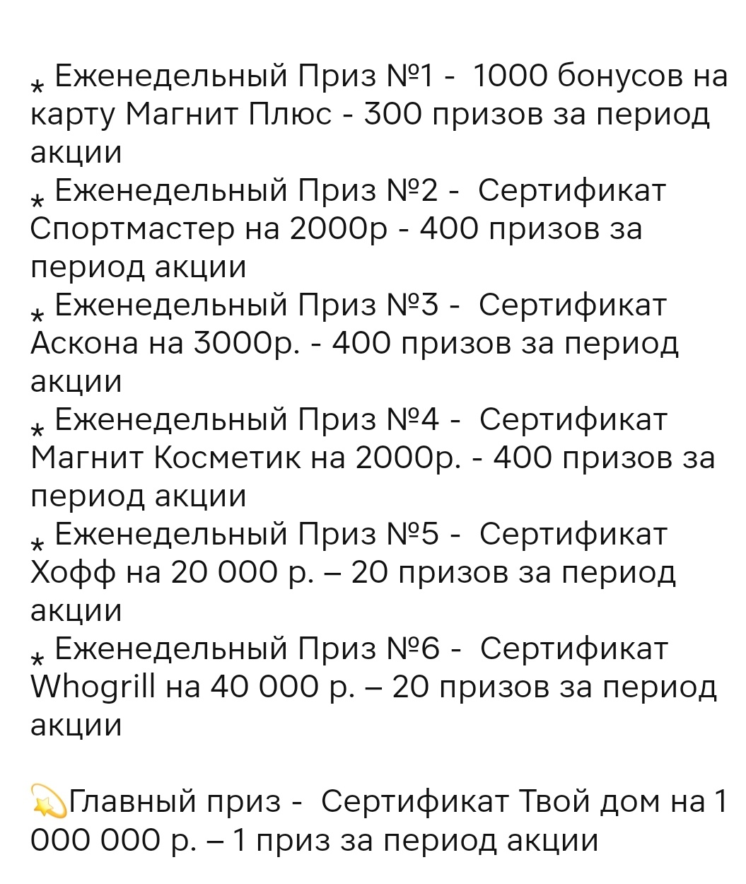- 1000 бонусов на карту Магнит Плюс - 75 шт. в неделю, всего 300 призов;