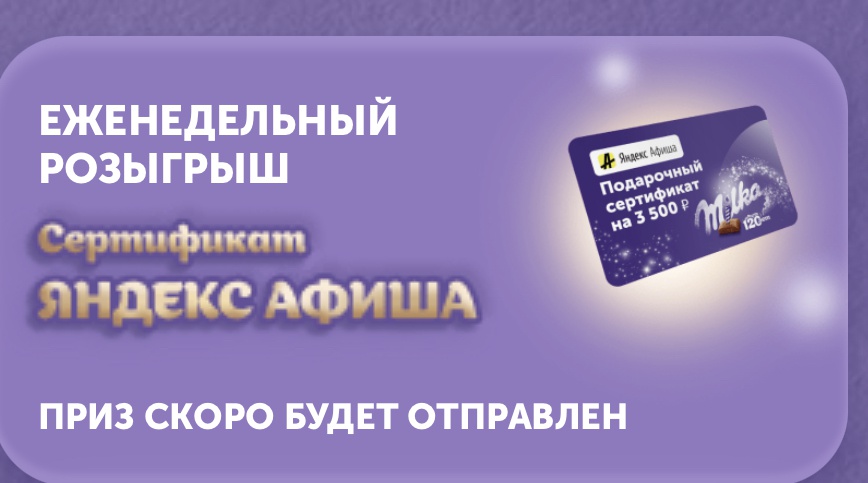 - Еженедельный приз: Электронный сертификат Эмпрана на получение подарка - «впечатления» номиналом 3 000 рублей в количестве 1 150 штук и сертификат Яндекс.Афиша номиналом 3 500 рублей в количестве 550 штук.