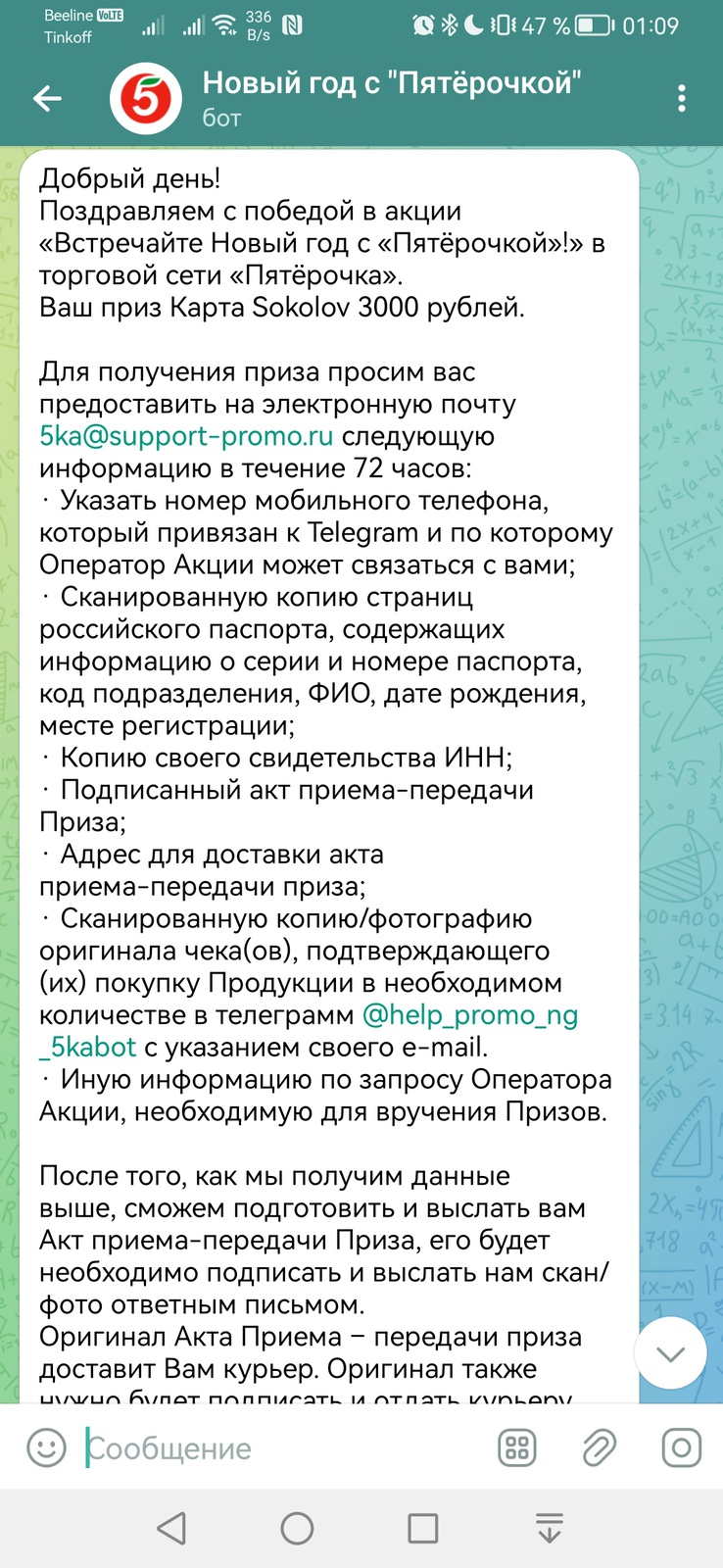 Чек не соответствует условиям акции.-пришло сначала такое сообщение, а по итогу чек сыграл и выиграл сертификат Sokolov номиналом 3000 рублей