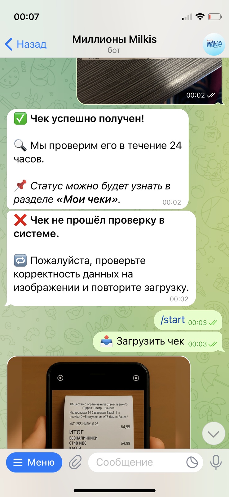 - Регистрируйте чеки в чат-боте Telegram - @million_milkis_bot;