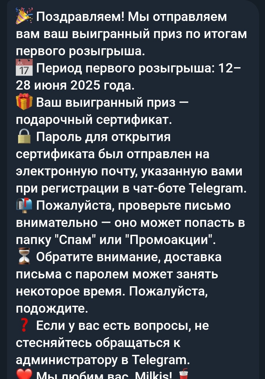 Да и в части "Дата проведения розыгрыша и сообщения победителям: в 09:00 (МСК) 13 июля 2025 года" - также не соблюдались время и сроки) в части по рассылке сообщений - точно) Как там раздача - только гадать)