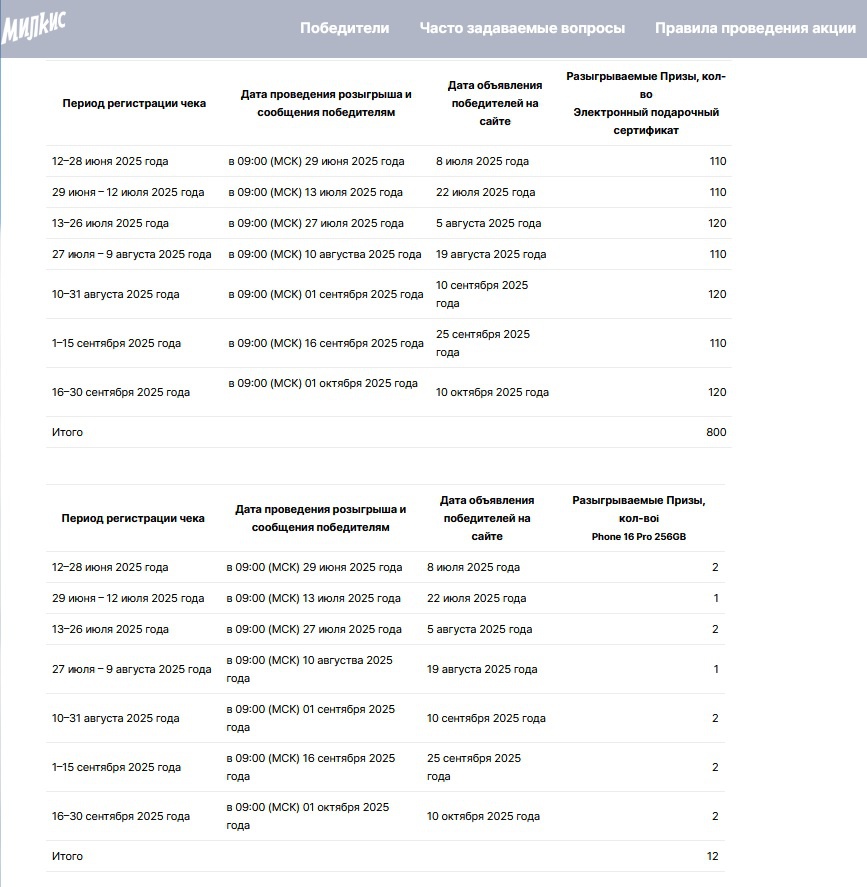 - Общий срок проведения Промоакции, включая розыгрыши и доставку призов: с 1 июня 15 октября 2025 года;