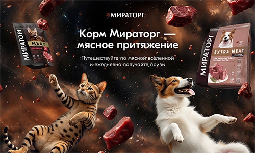Корм Мираторг — мясное притяжение. Путешествуйте по мясной вселенной и ежедневно получайте призы.