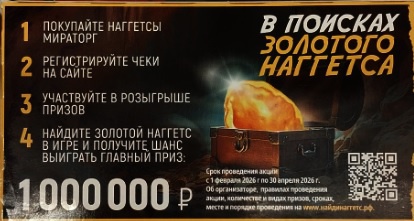 С 1 февраля 2026 года участвуйте в акции от Мираторг. Покупайте наггетсы Мираторг, регистрируйте чек и участвуйте в розыгрыше призов. Найдите золотой наггетс в игру и получите шанс выиграть главный приз - 1 000 000 рублей.