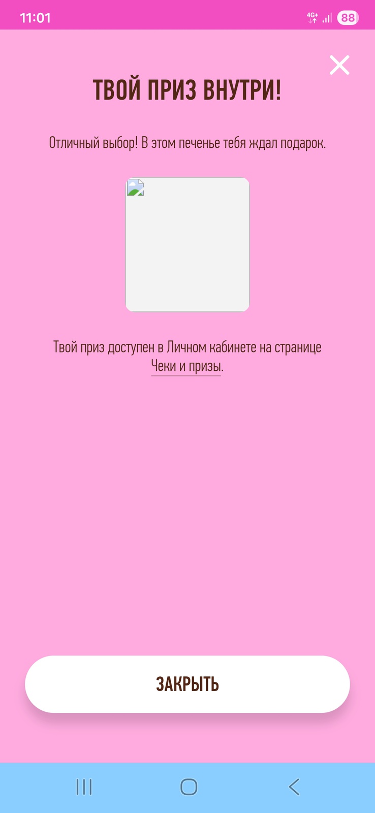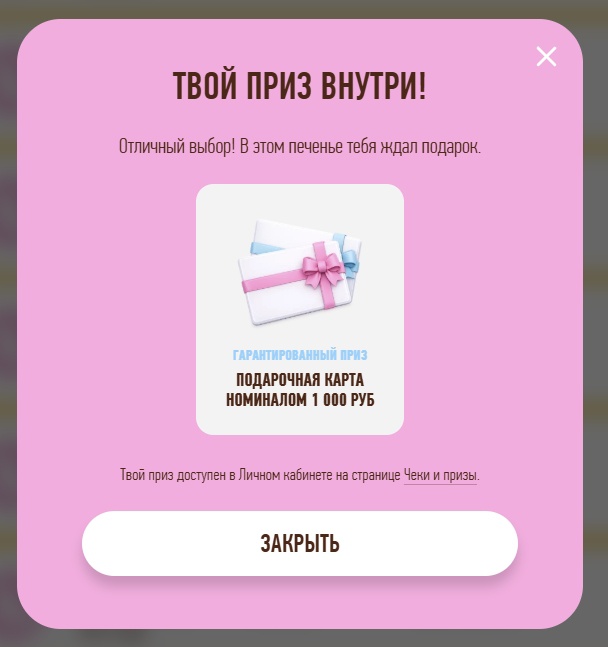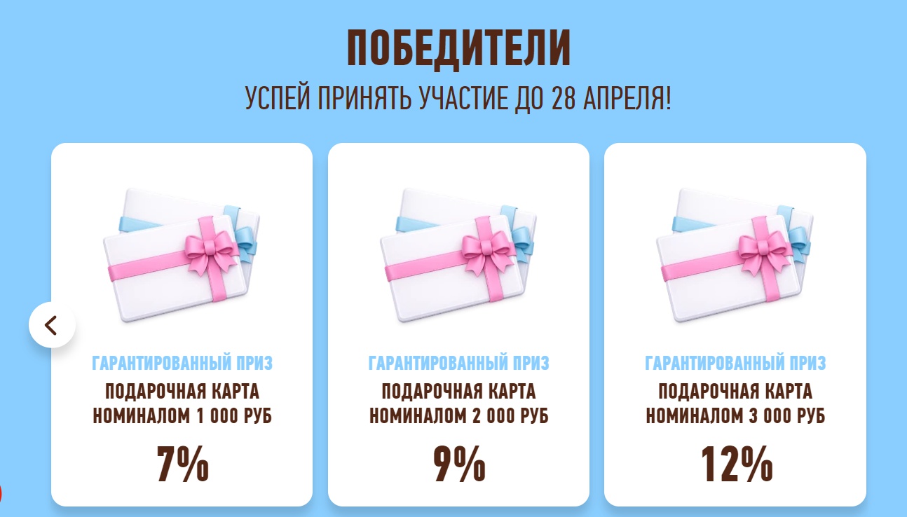 - Приз за прохождение теста - двойной шанс на победу. Приз не вручается в физическом виде, а присваивает следующей после получения приза заявке на участие в розыгрыше Главного приза (зарегистрированному и принятому к участию в Акции чеку) 2 строки в реестре заявок на участие в розыгрыше.