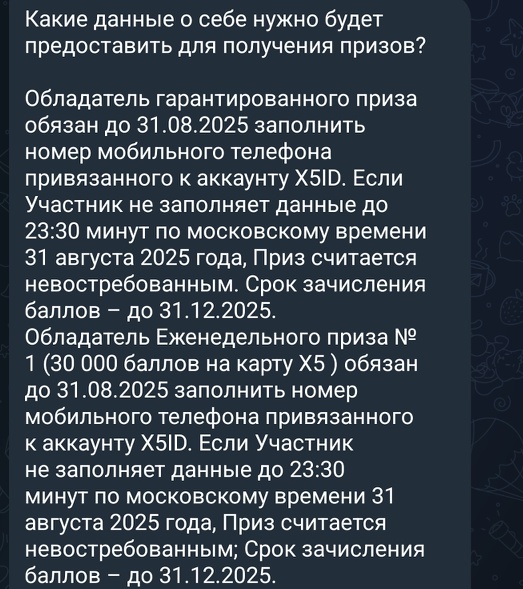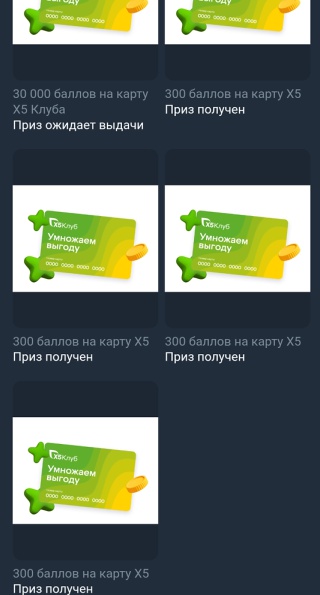 - «30 000 баллов на карту Х5 Клуба» – представляет из себя баллы, которые зачисляются на карту лояльности Х5 - 40 шт.;