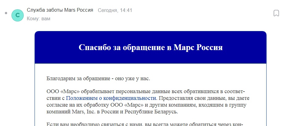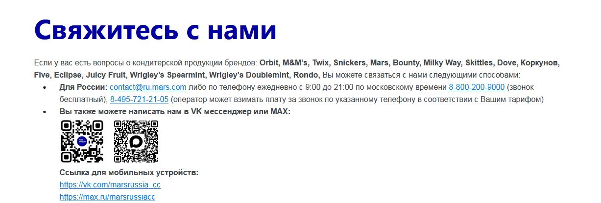 Для России: contact@ru.mars.com либо по телефону ежедневно с 9:00 до 21:00 по московскому времени 8-800-200-9000 (звонок бесплатный), 8-495-721-21-05 (оператор может взимать плату за звонок по указанному телефону в соответствии с Вашим тарифом)