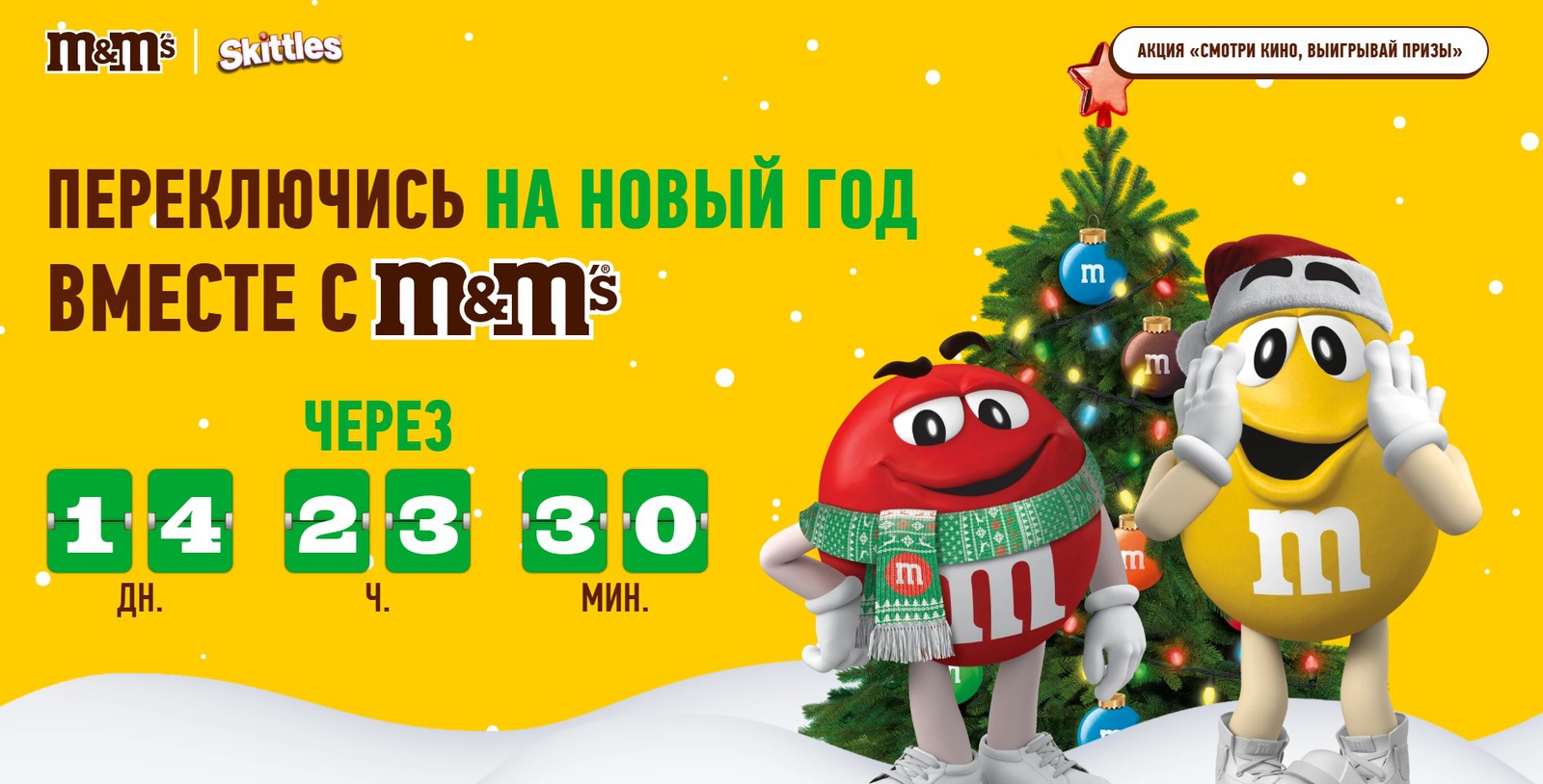 С 5 ноября 2025 года участвуйте в акции от M&M's и Skittles. Покупайте продукцию, участвующую в акции, регистрируйте чек и выигрывайте кинопризы!