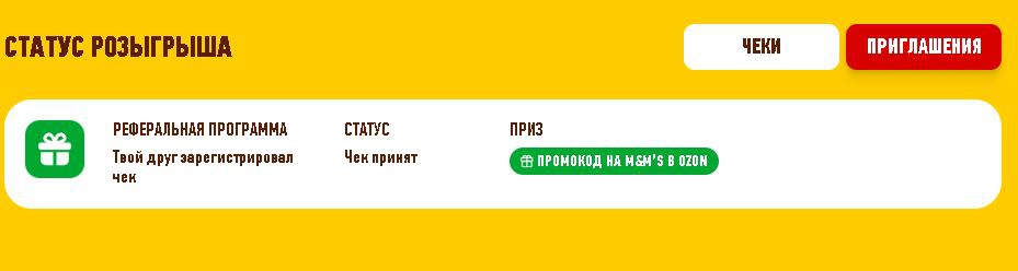 - Приз за участие в реферальной программе: «Промокод на M&M’s в Ozon»" - 3000 шт.