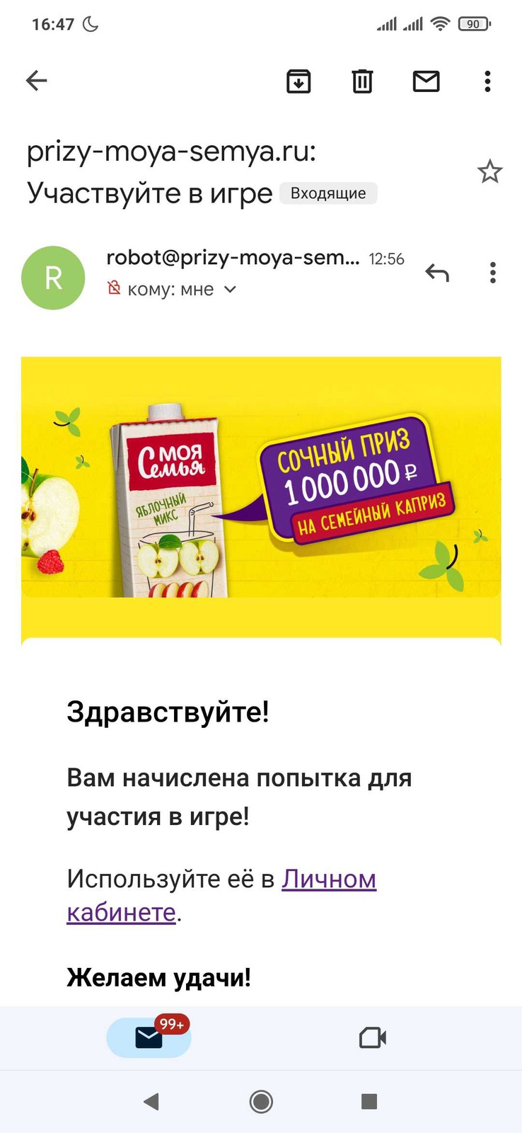 С 27 марта 2023 года участвуйте в акции от сока Моя Семья. Покупайте напитки Моя Семья, участвующие в акции, получайте гарантированные призы, принимайте участие в розыгрыше еженедельных призов, а также получите возможность выиграть главный приз - 1 000 000 рублей.