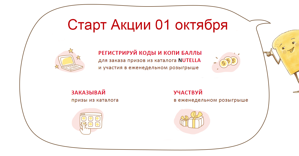 Участвуй в акции от Нутелла! Регистрируй коды и копи баллы для заказа призов из каталога NUTELLA и участия в еженедельном розыгрыше!