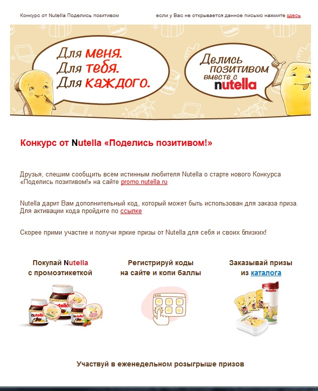 Рекламное стимулирующее мероприятие «Поделись позитивом!». Заявки на участие принимаются с 01.10.2014 по 30.11.2014 включительно. Призёры объявляются не позднее 15.12.2014 на сайте www.promo.nutella.ru. Общий срок проведения, включая предоставление призов, с 01.10.2014 по 01.03.2015 включительно. Количество призов ограничено.