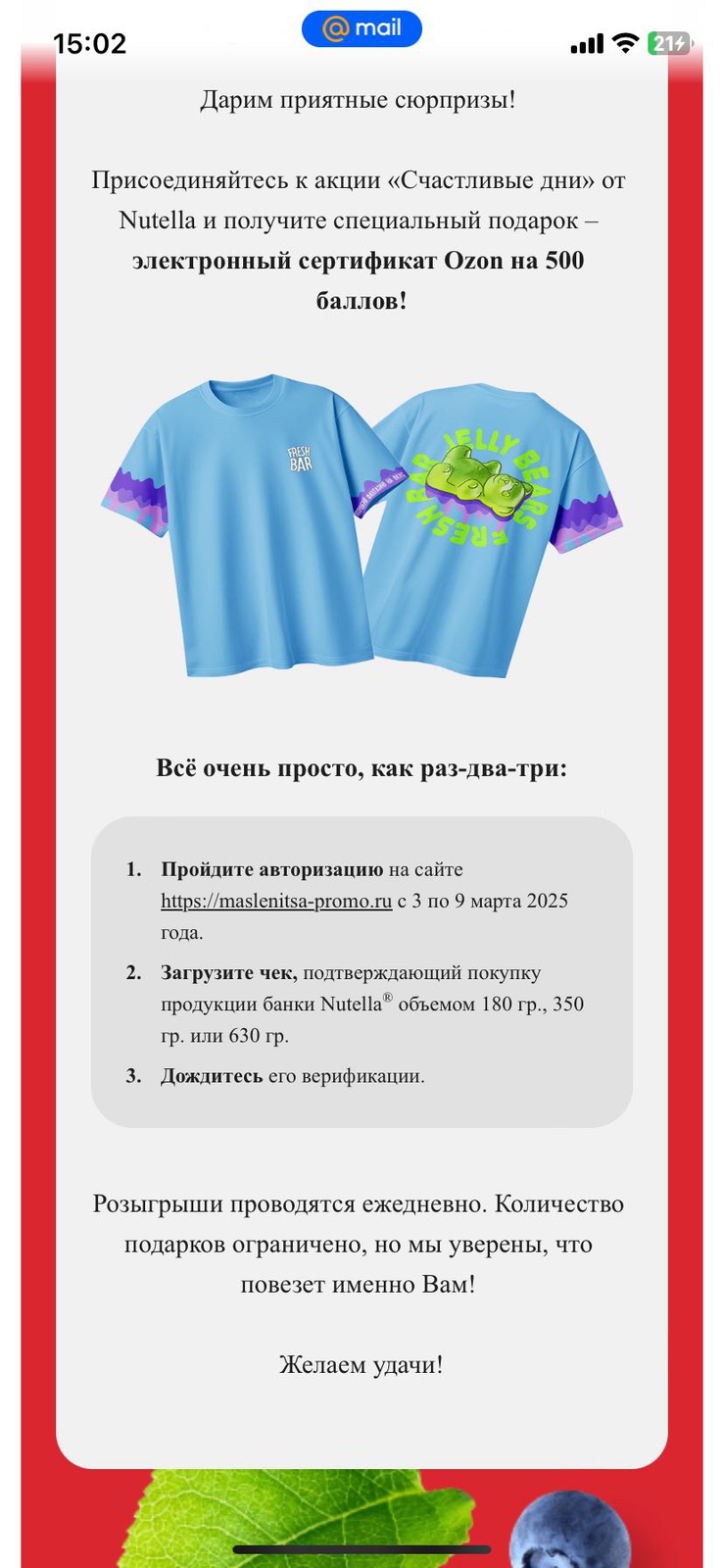 - Покупайте продукцию Nutella на сумму от 299 руб. и регистрируйте чек на сайте акции;