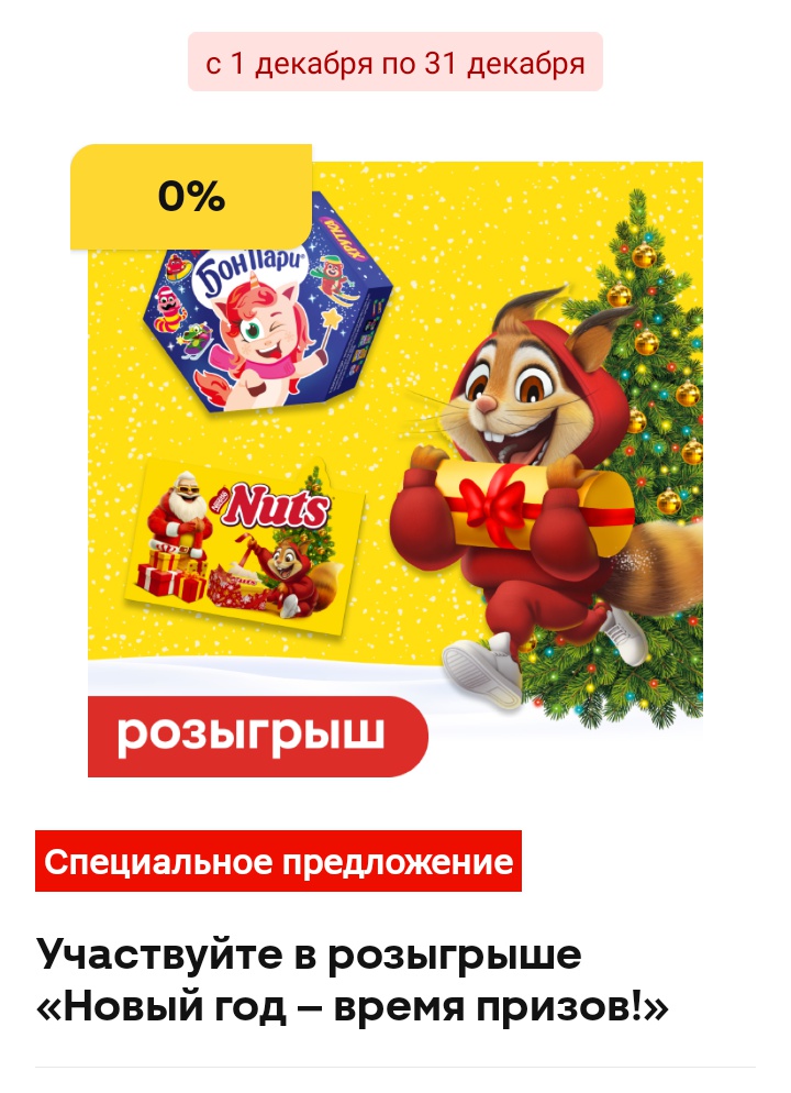 - В период с 01.12.2025 по 31.12.2025 купите товары-участники брендов NUTS®, GOODMIX®, «РОССИЯ» – ЩЕДРАЯ ДУША!®, КОМИЛЬФО®, БОН ПАРИ®, РОДНЫЕ ПРОСТОРЫ®, предъявив на кассе виртуальную карту Магнит Плюс;