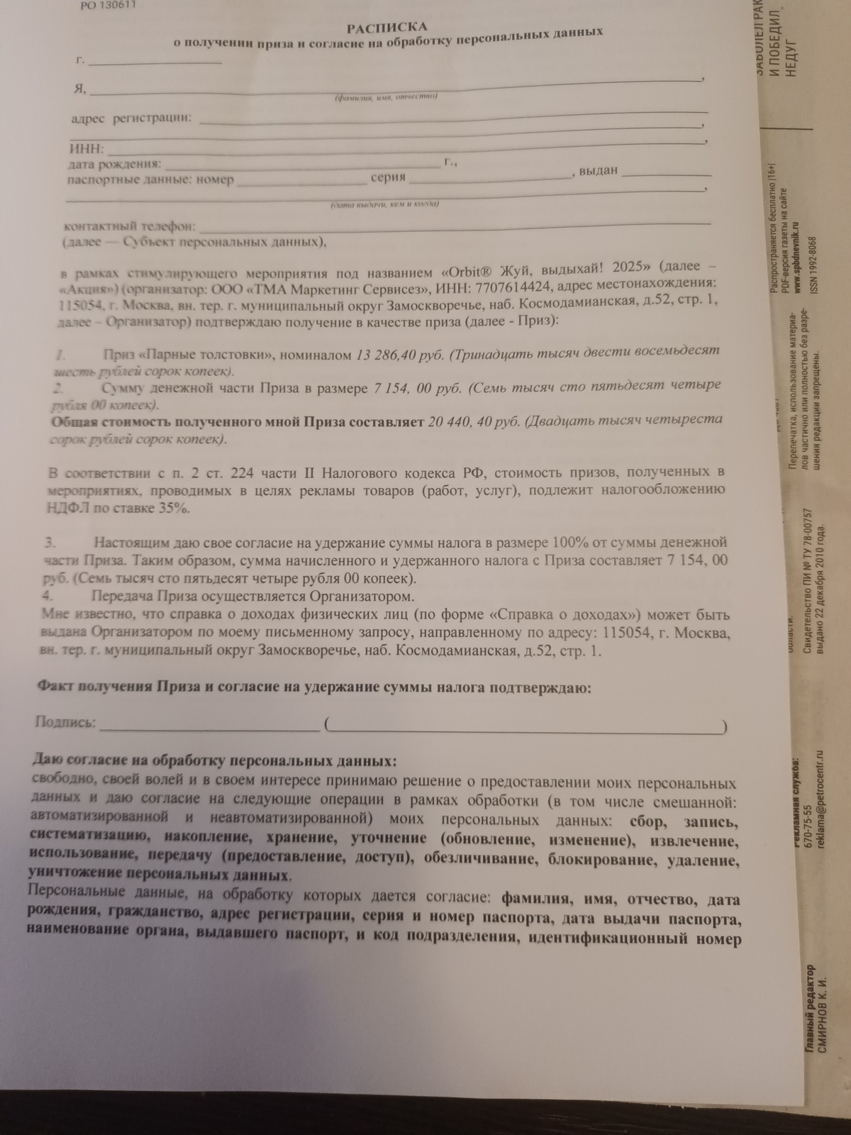При выдаче приза, стоимость которого превышает 4 000 (четыре тысячи) рублей 00 копеек, Оператор исполняет обязанности налогового агента и исчисляет налог на доходы физических лиц, удерживая его из такого приза (удерживается денежная часть)