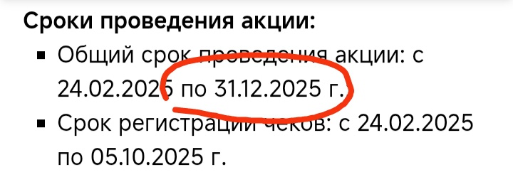 - Общий срок проведения акции: с 24.02.2025 по 31.12.2025 г.;