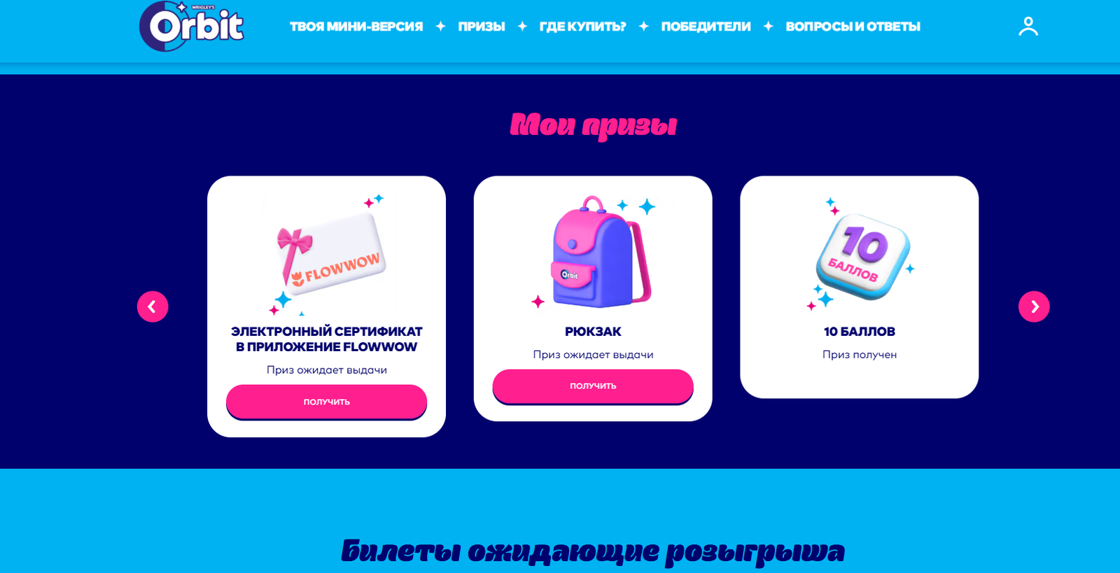 - Гарантированный приз (за сканирование упаковки Orbit®):