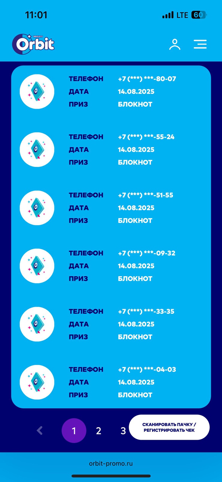 - Гарантированный приз (за сканирование упаковки Orbit®):
