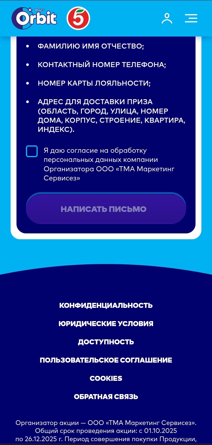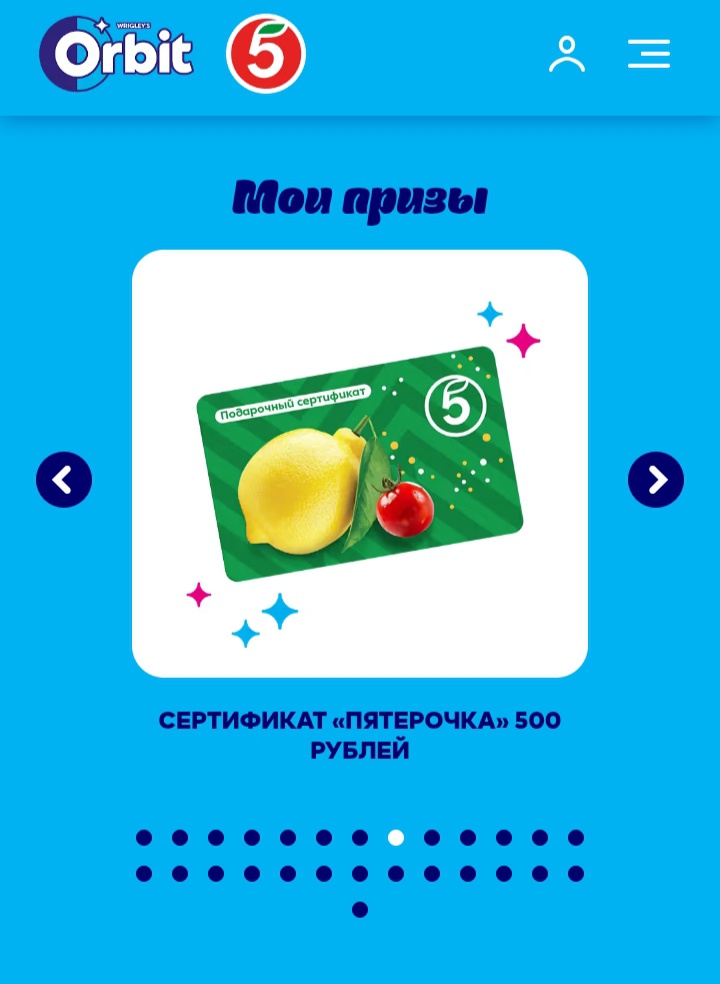 Купите любой продукт Orbit® в сети магазинов «Пятерочка», регистрируйте чек, получайте гарантированный приз и участвуйте в розыгрыше еженедельных призов и главного приза.