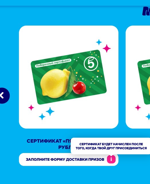 - Сертификат «Пятерочка» номиналом 100 руб. за приглашение друга — 400 шт.
