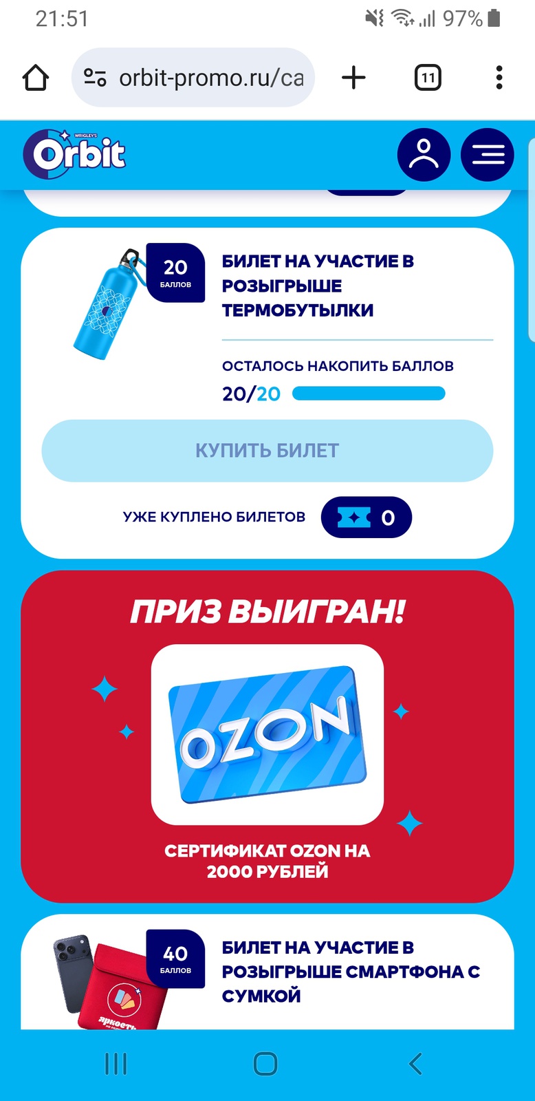 - Купон на скидку на покупку Orbit® в сервисе Ozon — 11 749 шт.