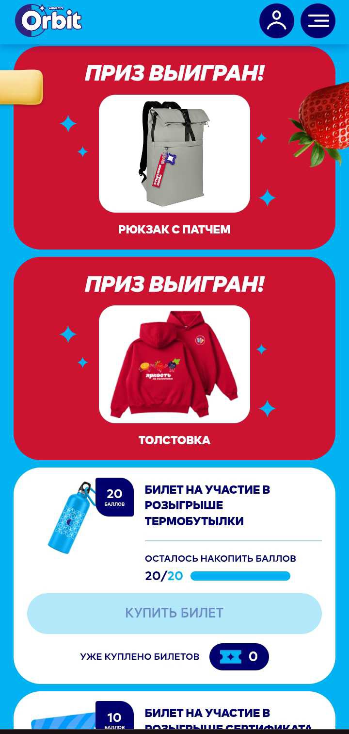 Покупайте любой продукт Orbit®, регистрируйте чеки и копите баллы, обменивай баллы на эксклюзивный мерч и шансы на участие в розыгрыше призов.