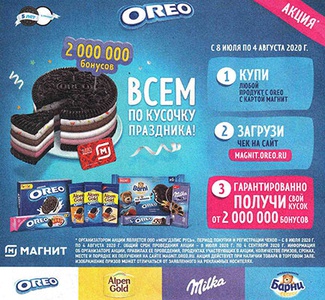 С 8 июля 2020 года участвуйте в акции от печенья Oreo и получи свой кусок от 2 000 000 бонусов!
