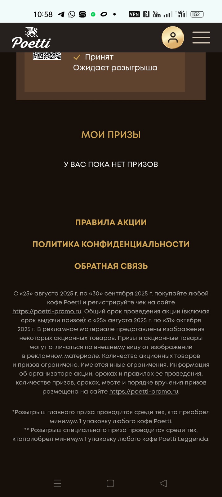 С 25 августа 2025 года участвуйте в акции от Poetti. Покупайте кофе Poetti, регистрируйте чек и выигрывайте призы. Главный приз - глэмпинг на Камчатке на 1 000 000 рублей. Покупайте Poetti Leggenda и участвуйте в розыгрыше специального приза.
