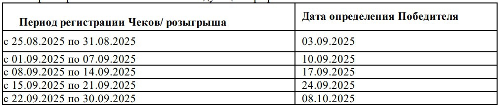 - Период совершения покупки и регистрация Чеков на Сайте с «25» августа 2025 г. по «30» сентября 2025 г.