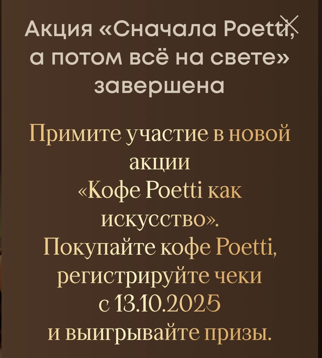 С 25 августа 2025 года участвуйте в акции от Poetti. Покупайте кофе Poetti, регистрируйте чек и выигрывайте призы. Главный приз - глэмпинг на Камчатке на 1 000 000 рублей. Покупайте Poetti Leggenda и участвуйте в розыгрыше специального приза.