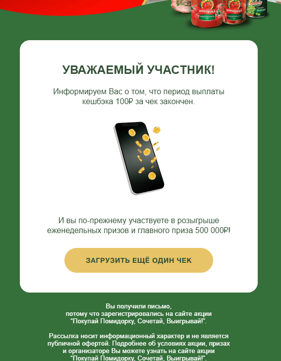 - Регистрируйте чек в чат-боте Telegram @pomidorka_idea_bot или на сайте акции;