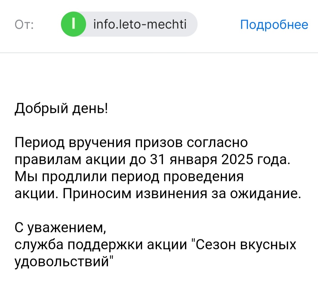 Период вручения призов согласно правилам акции до 15 декабря 2024 года. Приносим извинения за ожидание.