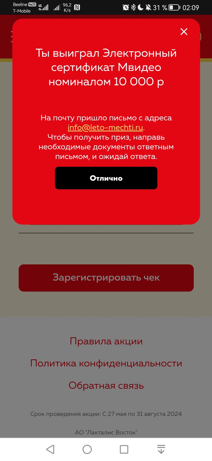 - Зарегистрируйте чек на сайте акции или через чат-бот акции;