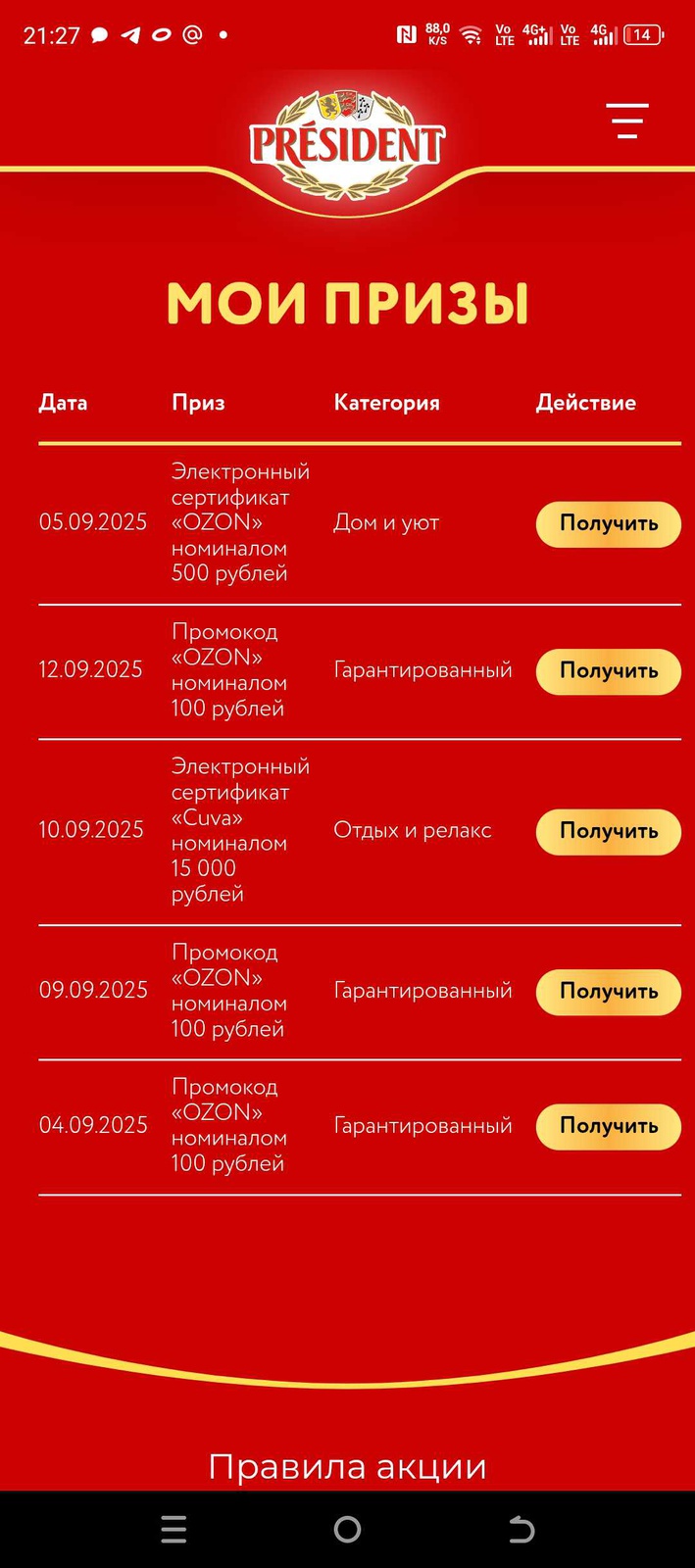 Покупайте сыр с благородной плесенью President, регистрируйте чек, получайте гарантированный приз и участвуйте в розыгрыше призов.