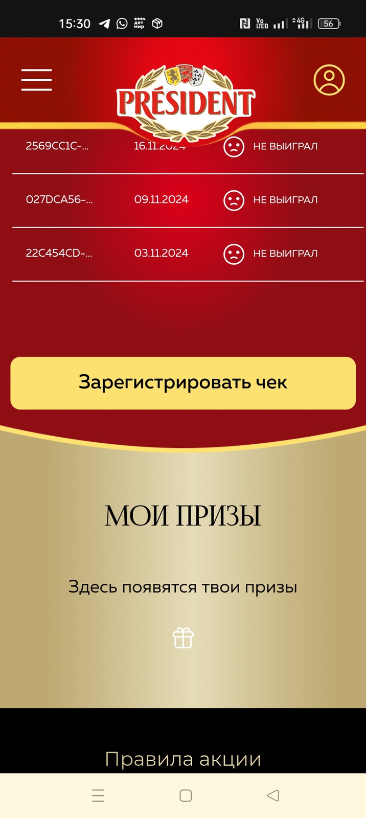 Покупайте сыр с благородной плесенью President, регистрируйте чек и участвуйте в розыгрыше призов. Выигрывайте дополнительные призы в онлайн-игре.