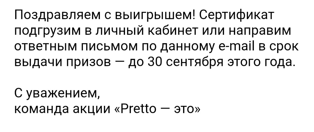 А кто ни будь еще выиграл в этой акции от претто нам не претто ?помимо одного серта на 3к коллега 🌿 @Forest777 то под вопросом получил (или получит) его вообще.
