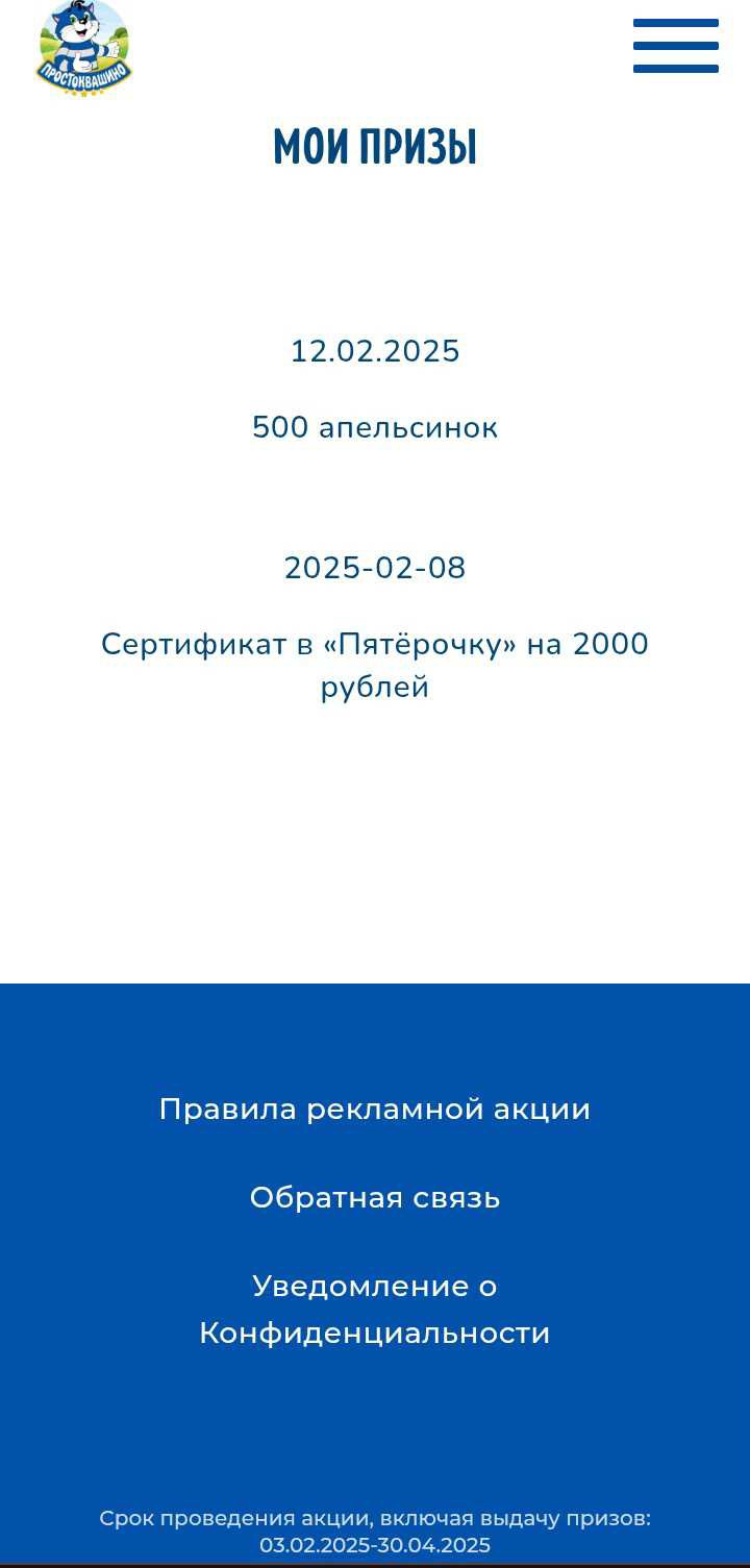 - Общий период совершения покупок Продукции и регистрации чеков: с «03» февраля 2025 г. по «02» марта 2025 г. включительно.