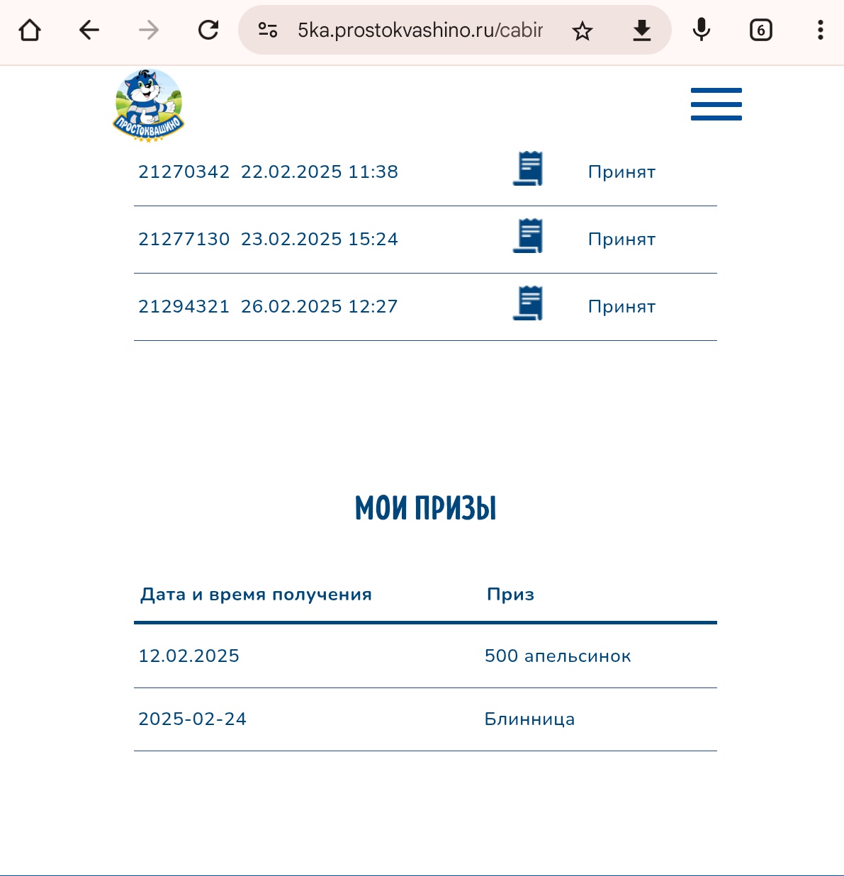 Покупайте от 2-х продуктов Простоквашино в магазинах «Пятерочка», регистрируйте чек и получите 500 апельсинок за 1-ю покупку, участвуйте в розыгрыше призов.