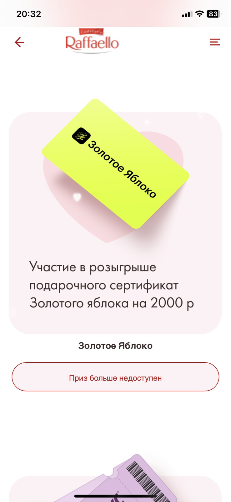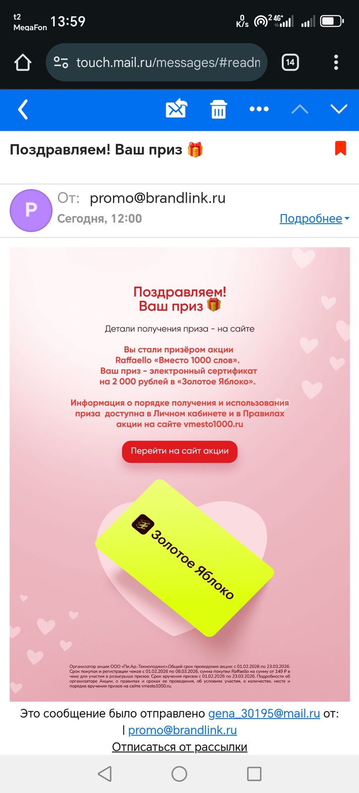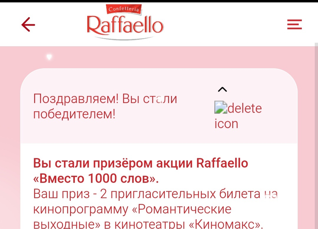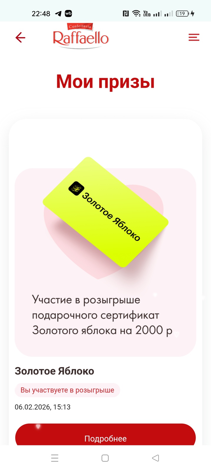 С 1 февраля 2026 года участвуйте в акции от Raffaello. Покупайте продукцию, участвующую в акции, на сумму от 149 рублей, регистрируйте чек, получайте кешбек и шанс выиграть призы: билеты в кино на романтические показы и сертификат в Золотое Яблоко.
