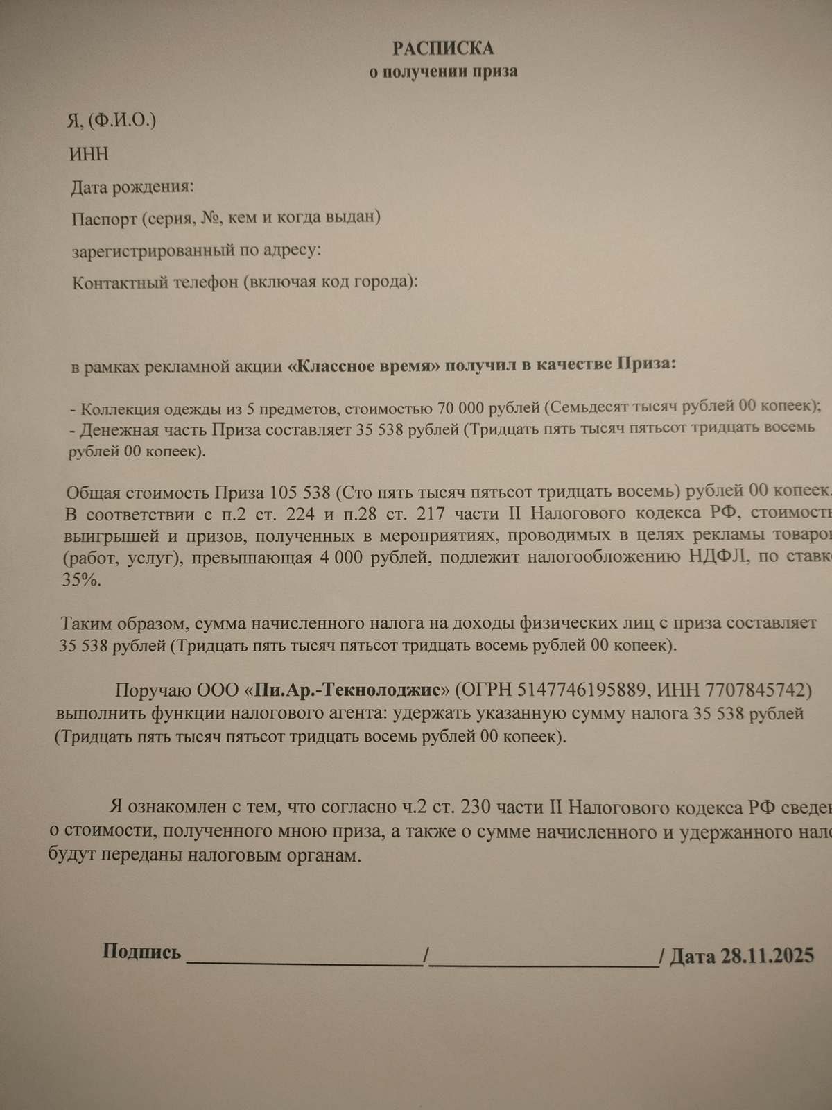 Организатор акции: «Пи.Ар.-Текнолоджис»