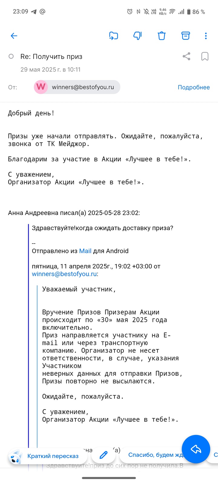 Гуля KRD @GulyaKrd, мне тоже не прислали и на письма не отвечают. Выиграла в первый день.