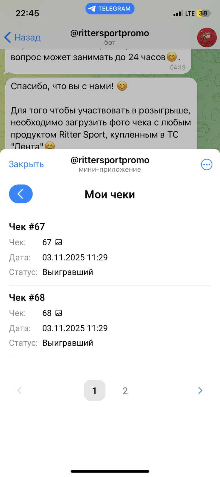 - Регистрируйте чеки в чат-боте Telegram - @rittersportpromoBot;