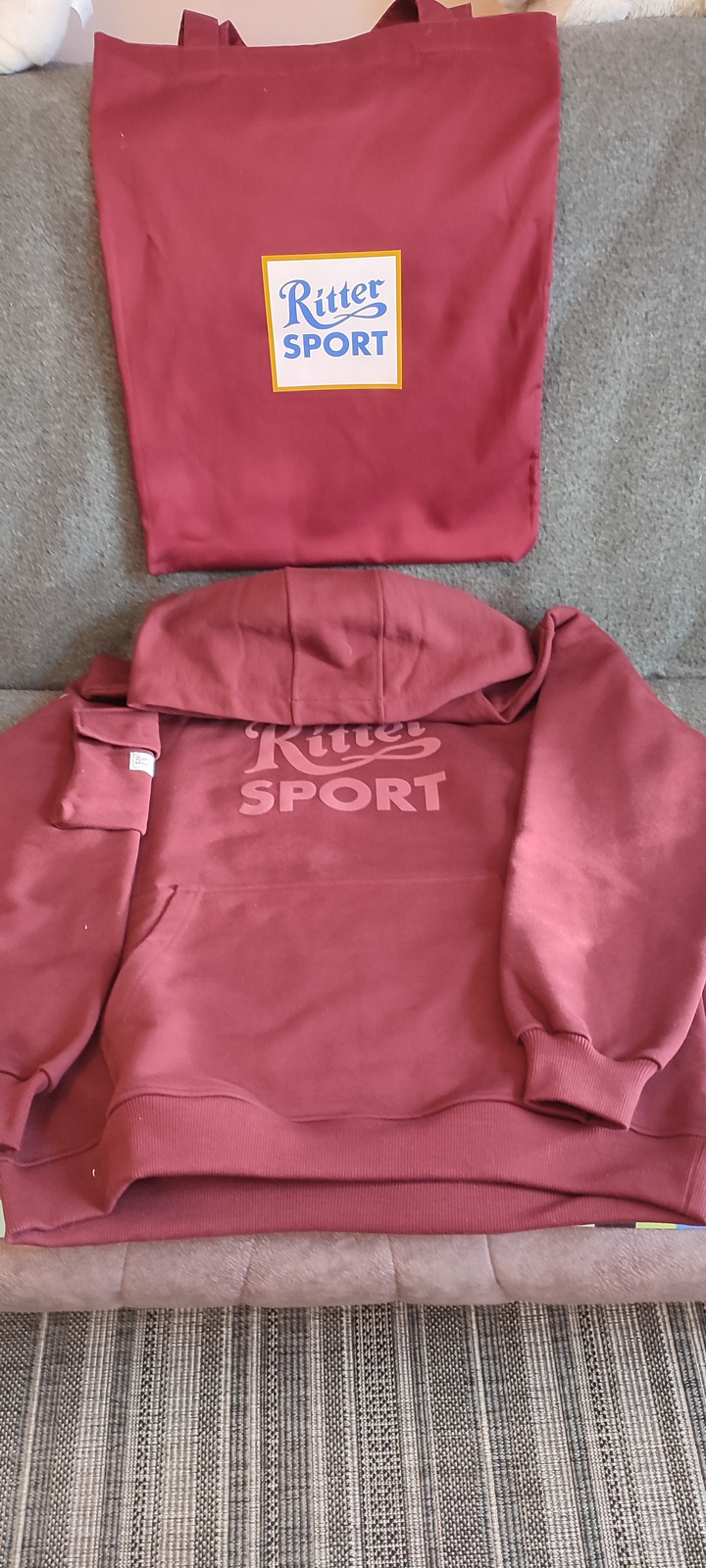 Курьер привез футболку. Размер М, но она огромная в ширину. Квадратная как сама шоколадка :joy: Очень толстая ткань для футболки. Не знаю на какого человека это сшили)) Сумочка в подарок прилагается.
