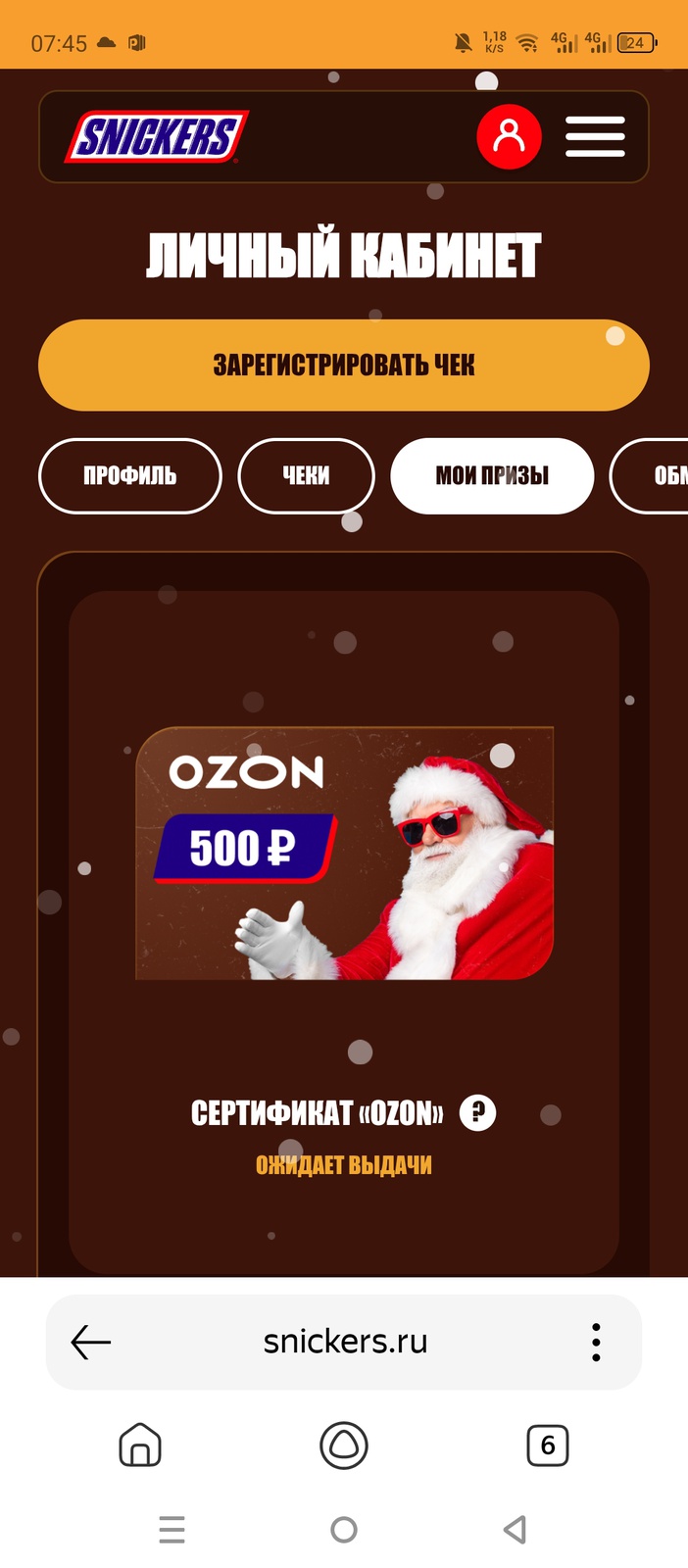 С 1 ноября 2025 года участвуйте в акции от Snickers. Покупайте продукцию Snickers®, Twix®, Mars®, Bounty®, Milky Way®, участвующую в акции, регистрируйте чек, получайте 1 балл за каждые 50 рублей в чеке, обменивайте баллы на призы.